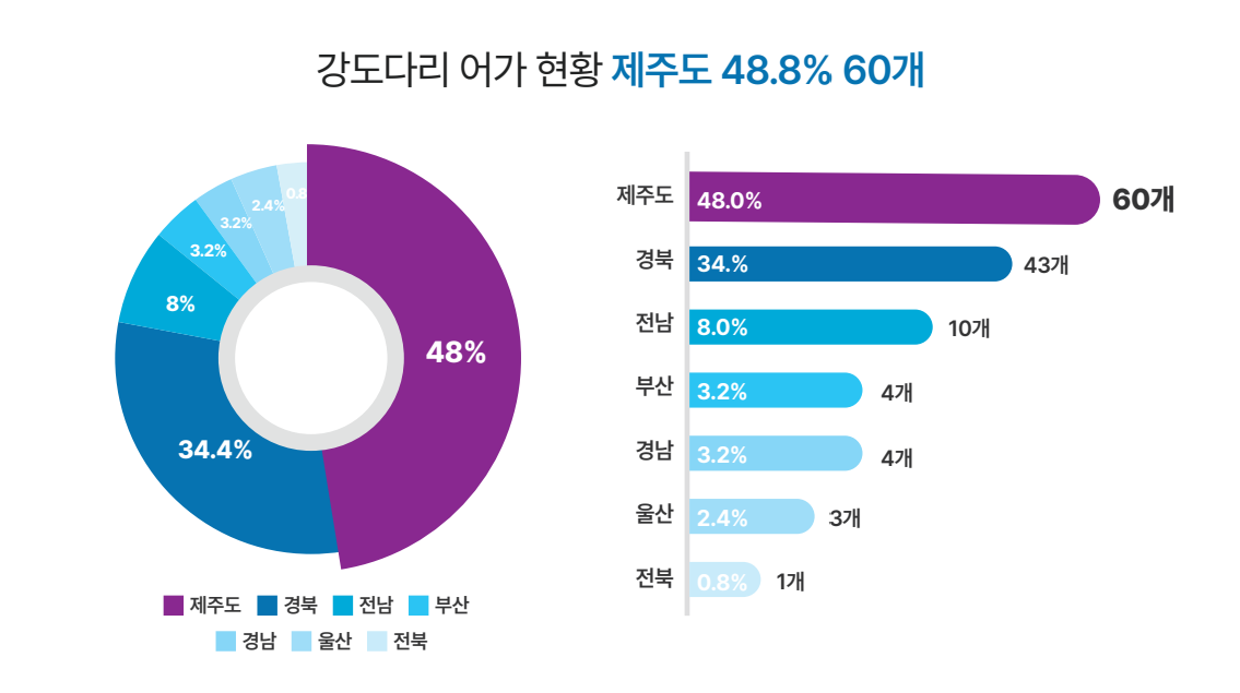 전국 강도다리 어가 현황과 생산량을 보시면 제주지역이 앞도적으로 높은 수치를 보여줍니다.